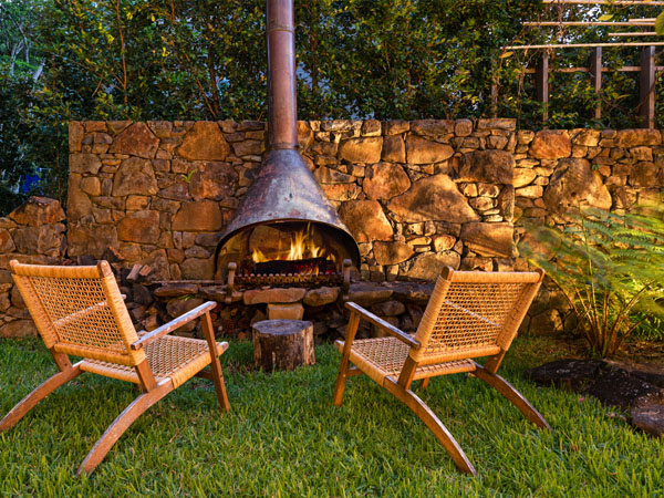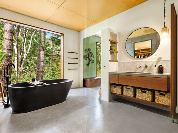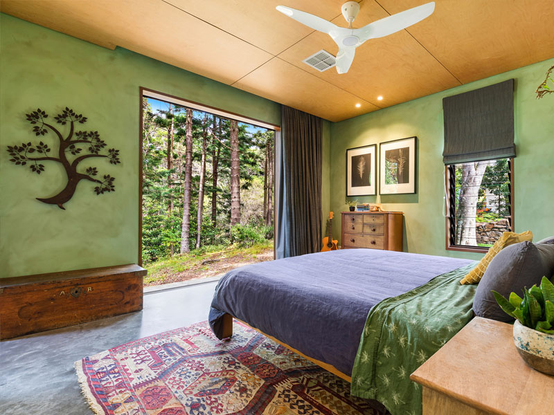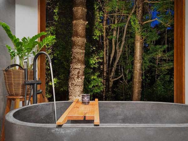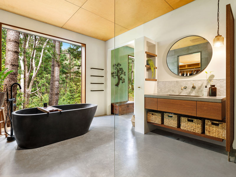 A concrete bathtub overlooks the rainforest reserve accompaning an oversized wood-floored shower. Steam away your cares in the evening. Indulge in a hot bath after a swim – gaze out on the rainforest, or be transfixed by the old-growth hoop pines, wallabies and bird-life.